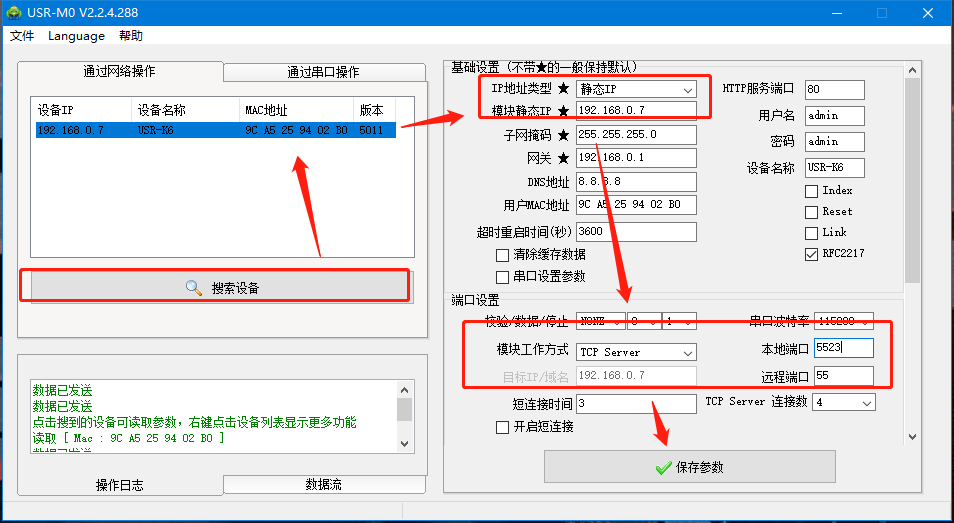 4、打開設(shè)置軟件,點(diǎn)擊“搜索設(shè)備”當(dāng)搜索列表中出現(xiàn)K6的設(shè)備后,點(diǎn)擊搜索到的設(shè)備,模塊工作方式設(shè)為TCP SERVER,本地端口5523,點(diǎn)擊保存參數(shù)。