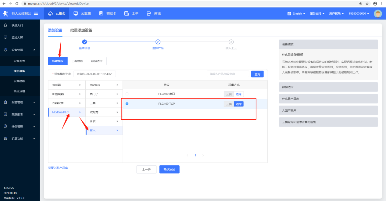 3.添加設(shè)備模板,選擇modbus/PLC》有人PLC100TCP
