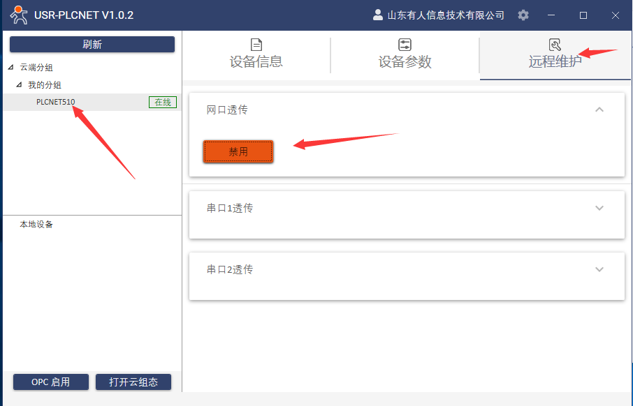 10.選中PLCNET510,選擇遠(yuǎn)程維護(hù),啟用網(wǎng)口透傳,電腦端會生成虛擬網(wǎng)卡