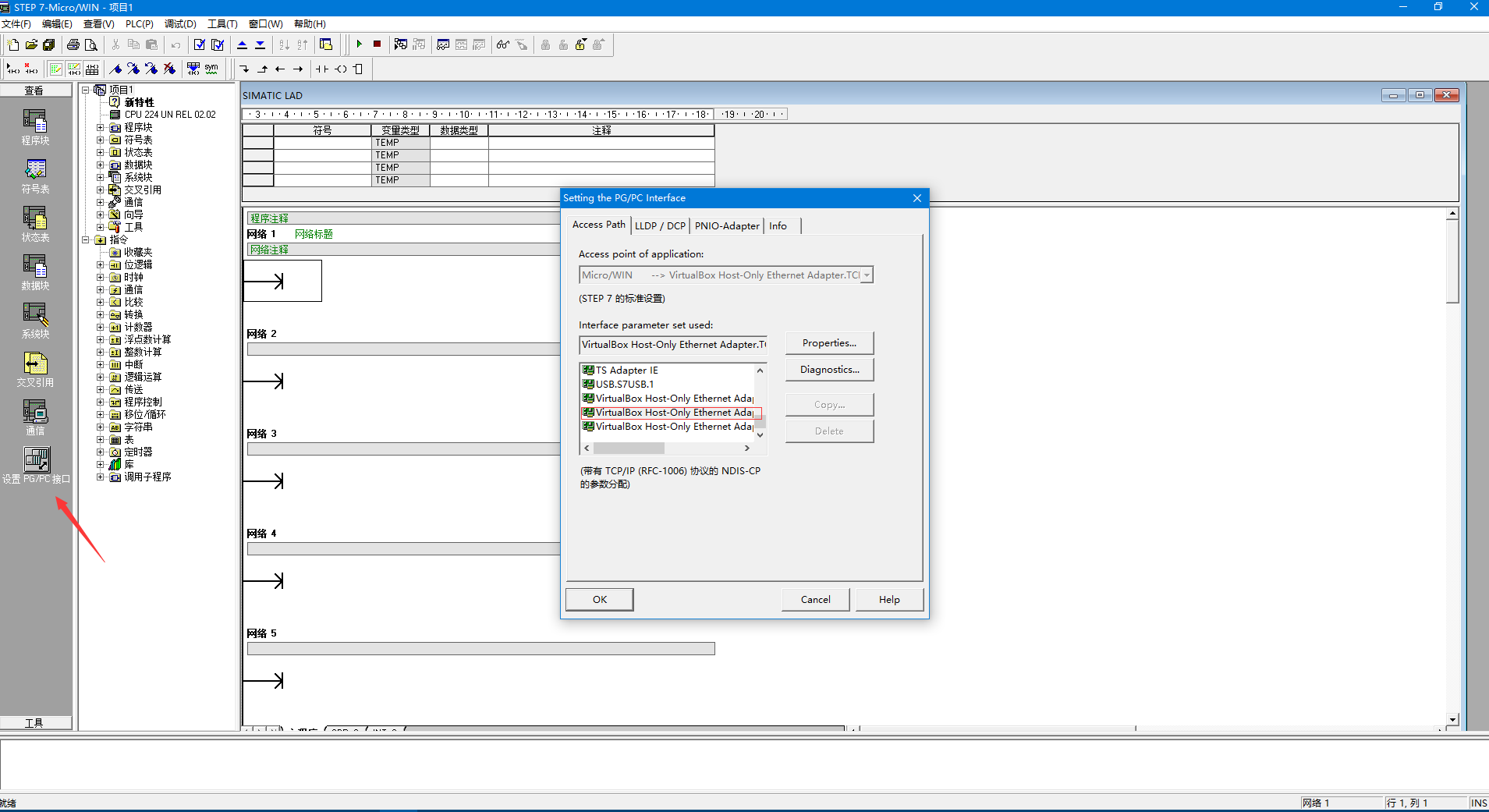 12.打開PLC100的上位機(jī)軟件,設(shè)置PG/PC接口,選擇虛擬網(wǎng)卡,點(diǎn)擊OK
