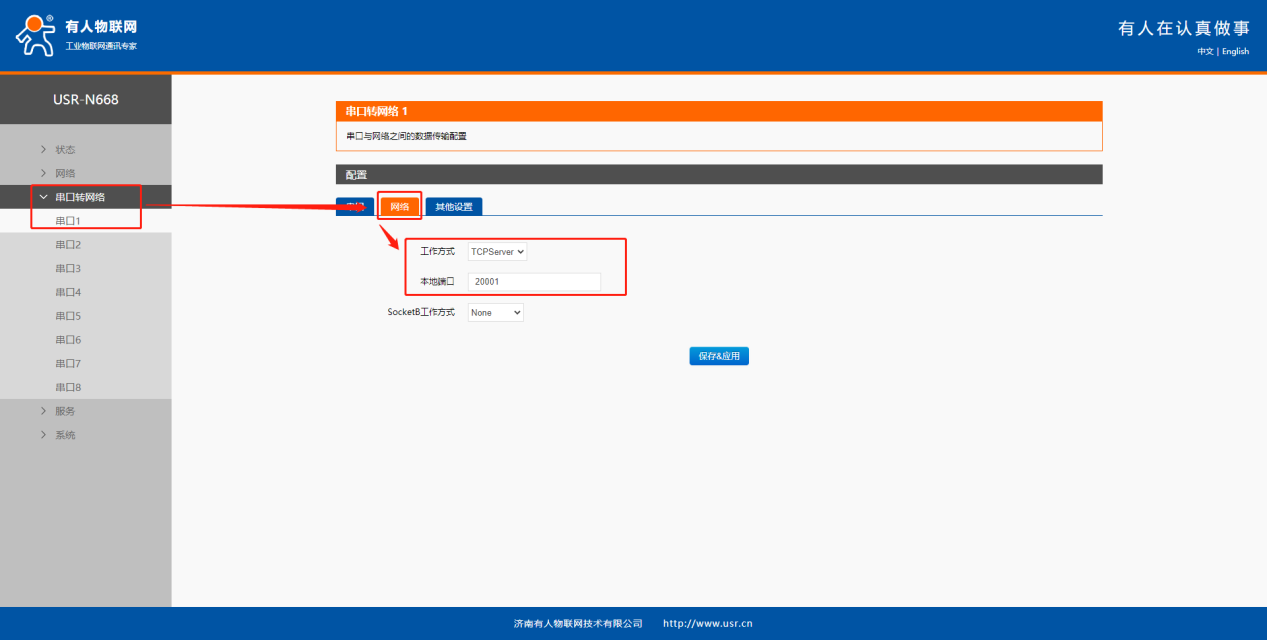 8、串口轉(zhuǎn)網(wǎng)絡(luò)確認(rèn)工作方式為:TCP SERVER,本地端口號(hào)為20001。