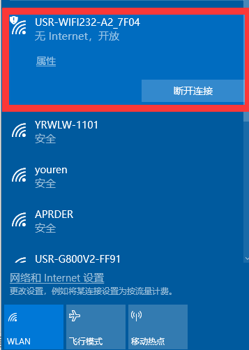 1、電腦打開無線網(wǎng)絡連接,搜索網(wǎng)絡,如下圖的“USR-WIFI232-B2_xxxx”(xxxx 是 MAC 地址后四位)即是模塊的默認網(wǎng)絡名稱(SSID)。電腦關(guān)閉防火墻與殺毒軟件并禁用除了wifi之外其他的網(wǎng)卡。