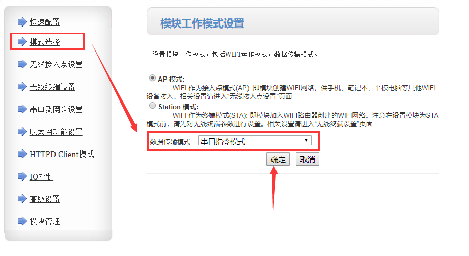 2、電腦瀏覽器地址欄輸入模塊默認IP:10.10.100.254,賬號和密碼都是admin,進入內(nèi)置網(wǎng)頁,模式選擇 -> 數(shù)據(jù)傳輸模式 -> 串口指令模式,點擊確定,串口及網(wǎng)絡設(shè)置 -> 網(wǎng)絡參數(shù)設(shè)置 -> 網(wǎng)絡模式配置為client,點擊確定,重啟模塊。