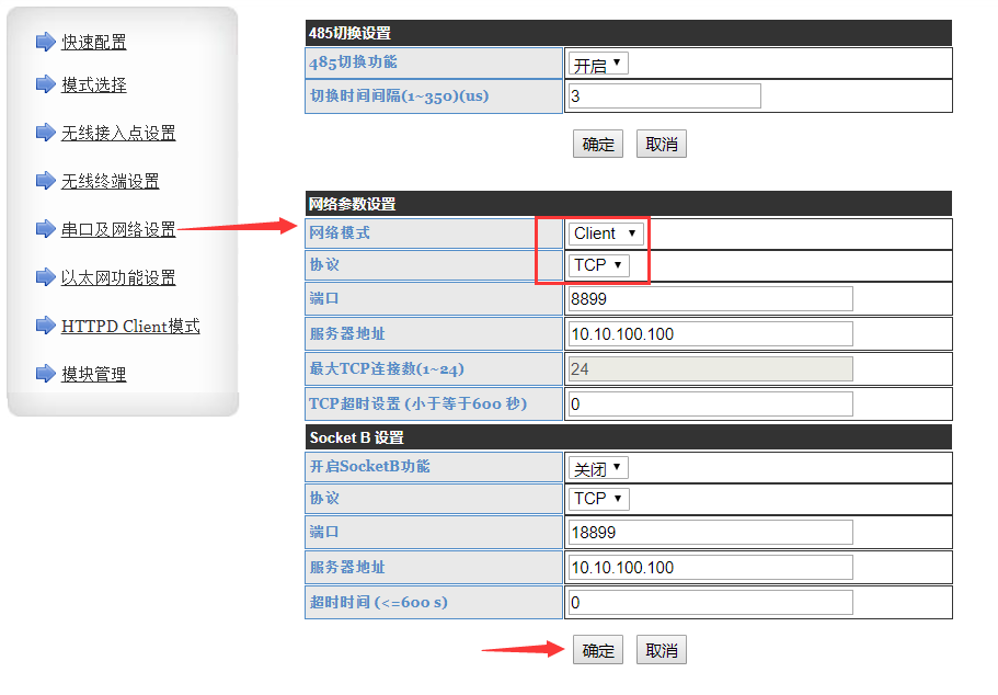 2、電腦瀏覽器地址欄輸入模塊默認(rèn)IP:10.10.100.254,賬號和密碼都是admin,進(jìn)入內(nèi)置網(wǎng)頁,模式選擇 -> 數(shù)據(jù)傳輸模式 -> 串口指令模式,點(diǎn)擊確定,串口及網(wǎng)絡(luò)設(shè)置 -> 網(wǎng)絡(luò)參數(shù)設(shè)置 -> 網(wǎng)絡(luò)模式配置為client,點(diǎn)擊確定,重啟模塊。