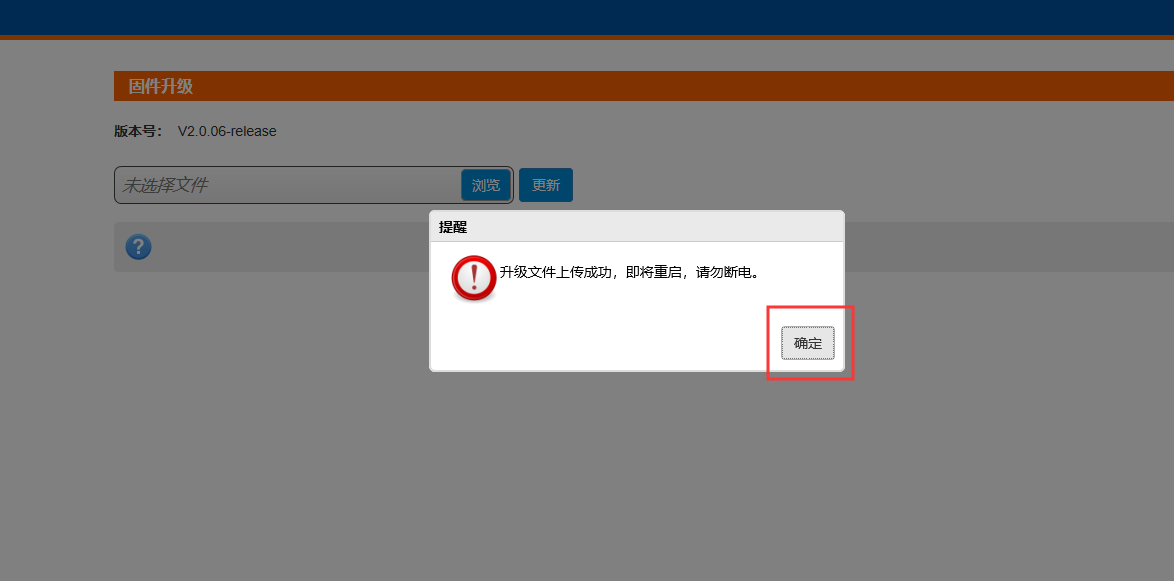 7.文件上傳成功后,會收到模塊即將重啟的提示,點擊確定。在升級過程中請勿關(guān)閉電源。(升級過程中設(shè)備斷電會造成死機,無法使用)