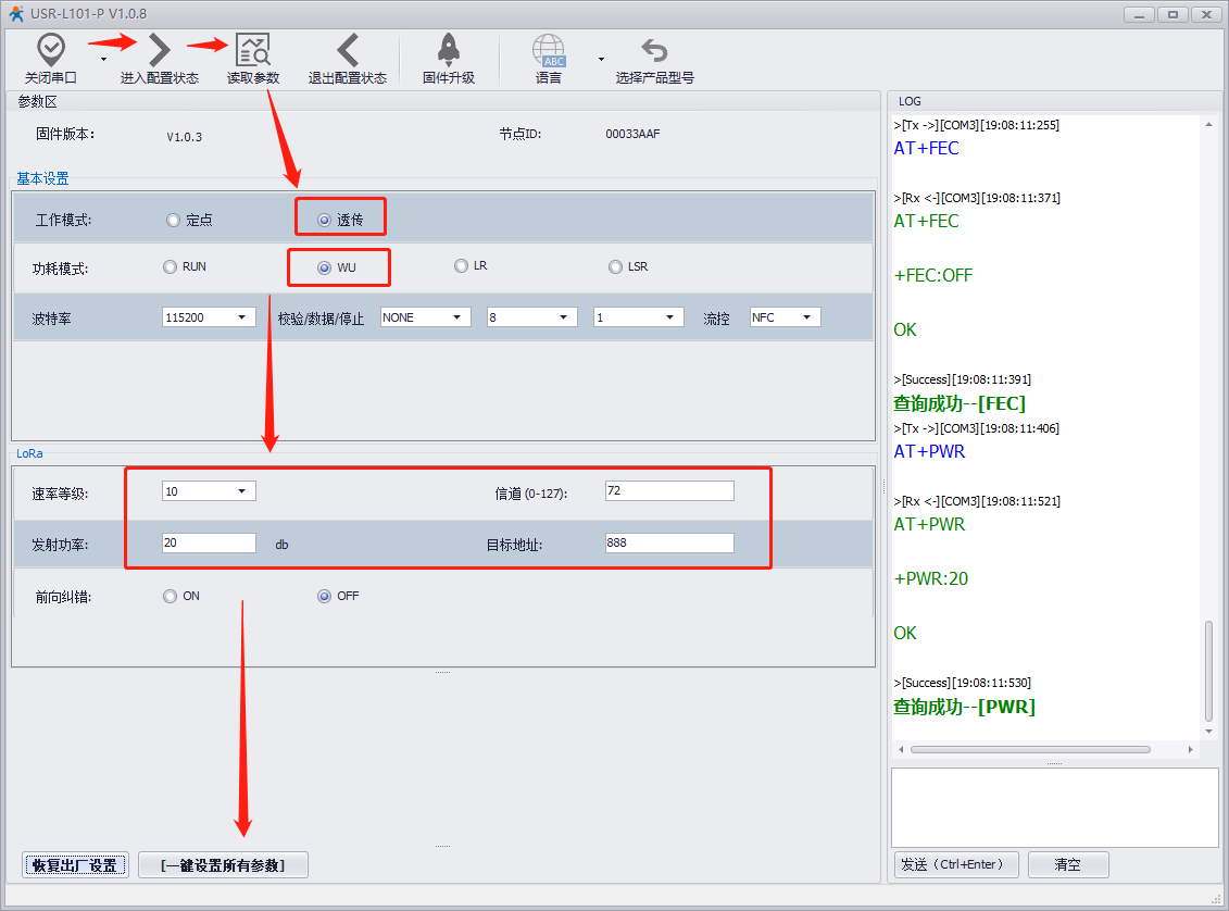 打開LoRa設置軟件(L101-P),依次點擊打開串口(選擇A對應的串口號,串口參數(shù):115200,None,8,1,NFC)、進入配置狀態(tài)、讀取參數(shù)、