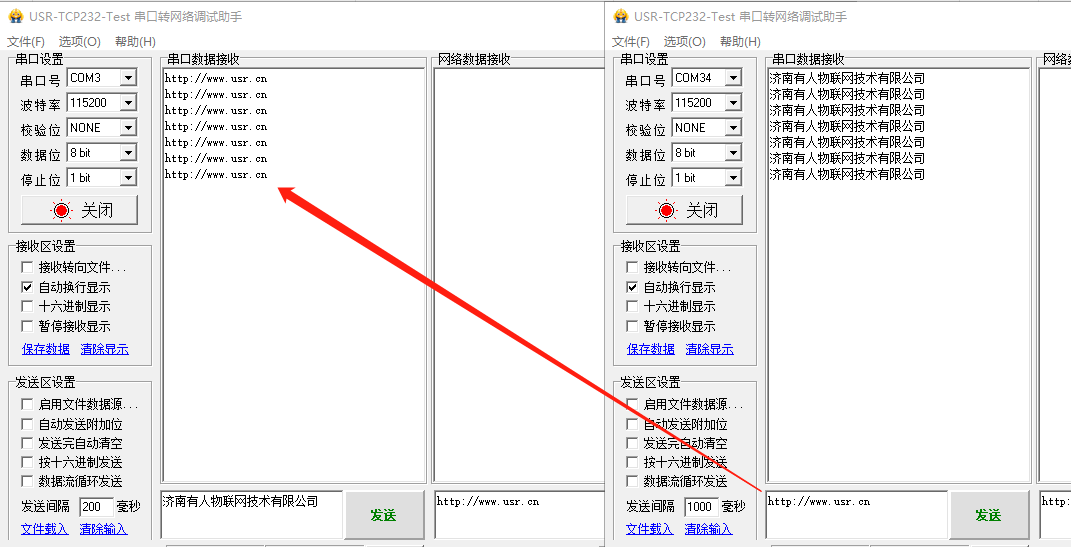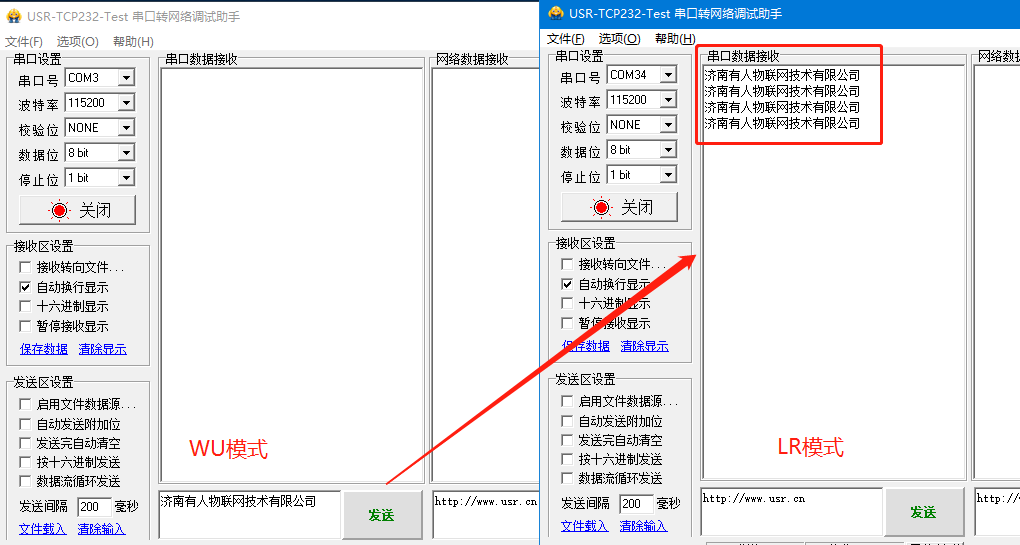 啟動兩個USR-TCP232-Test(模擬串口設備1,2)分別連接LoRa數(shù)傳終端A(com3)、B(com34)的串口,使用WU設備發(fā)送數(shù)據(jù)LR設備可接收數(shù)據(jù),通信效果如下圖所示: