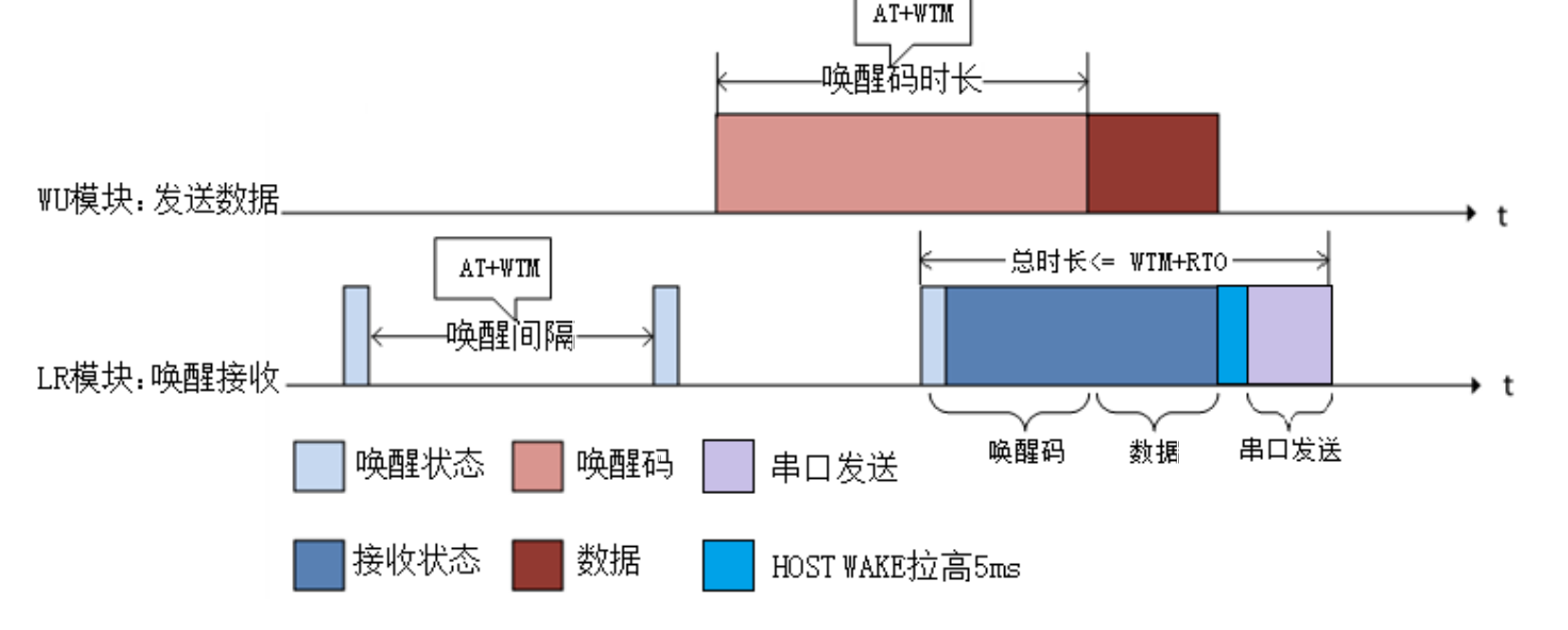 LR模式為低功耗接收模式,只能接收來工作在 WU 模式的模塊發(fā)出的數(shù)據(jù),LR模式接收串口數(shù)據(jù)發(fā)送時需要提前拉低WAKE 引腳喚醒。