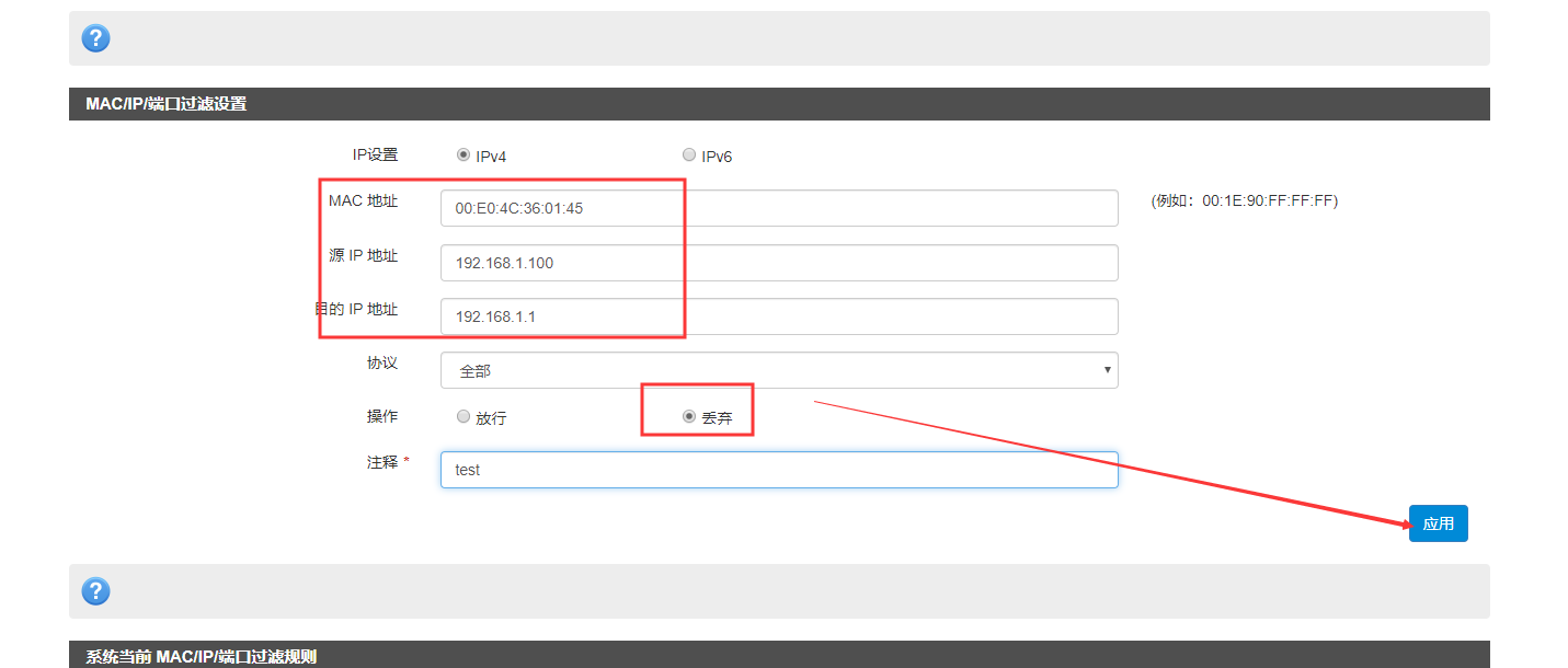 5.MAC和源IP地址設(shè)置連接805 的下級(jí)終端的MAC和IP,目標(biāo)IP設(shè)置禁止訪問(wèn)的IP,協(xié)議選擇全部,操作設(shè)置丟棄。