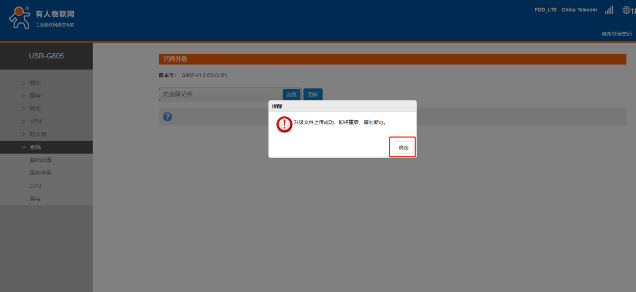 7.文件上傳成功后,會收到模塊即將重啟的提示,點擊確定。在升級過程中請勿關(guān)閉電源。(升級過程中設(shè)備斷電會造成死機,無法使用)