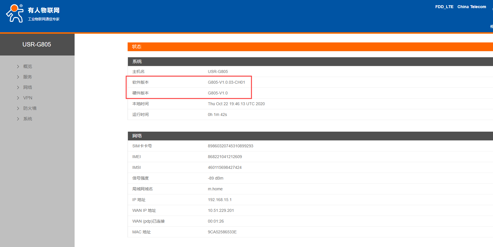 4.在概述--狀態(tài)界面可以看到硬件版本V1.0,軟件版本號為V1.0.03-CH01,現(xiàn)在將模塊固件升級為V1.0.06-release