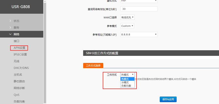 熱模式:在 APN 的 SIM 卡工作方式的配置里面選擇熱模式時,兩個 4G 模塊會同時聯(lián)網(wǎng),但是當前只用 SIM 卡 1 上網(wǎng),當 SIM 卡 1 不能聯(lián)網(wǎng)時,再檢查 SIM 卡 2 來進行聯(lián)網(wǎng)。