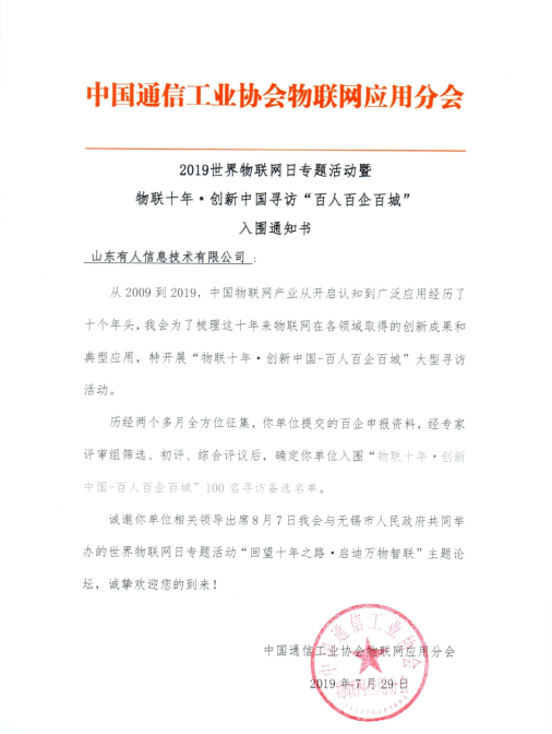 8月1日,中國通信工業(yè)協(xié)會(huì)公布“物聯(lián)十年·創(chuàng)新中國--百人百企百城”主題活動(dòng)入選名單。山東有人信息技術(shù)有限公司入選“物聯(lián)十年·百企”名單,公司創(chuàng)始人兼CEO古欣入選“物聯(lián)十年·百人”名單。