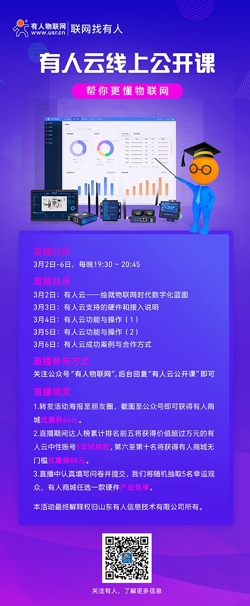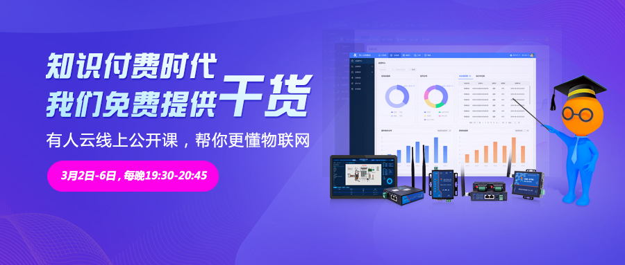 3月2日-6日、每天19點30-20點45,我們正式推出“有人云線上公開課”,特邀有人物聯(lián)網(wǎng)CIO、軟件事業(yè)部總監(jiān)王偉攜一眾技術(shù)、銷售精英,為大家詳解有人云產(chǎn)品知識,幫助大家選擇一個好的、合適的物聯(lián)網(wǎng)云平臺。