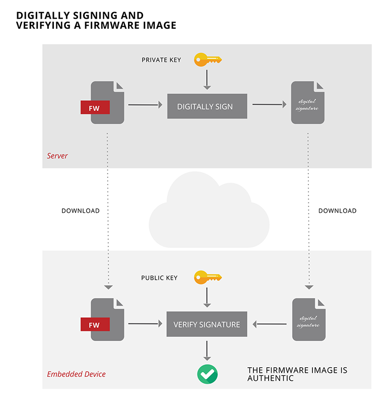 一個(gè)常用的方法是使用數(shù)字簽名。數(shù)位簽名和簽名驗(yàn)證被用來驗(yàn)證數(shù)據(jù)。在這種情況下作為固件映像文件的可靠性較高。原理是以不對(duì)稱的方式進(jìn)行加密,用一個(gè)加密的方式指定作為公鑰,另一個(gè)指定為私鑰??尚艁碓词褂盟接忻荑€簽署合法固件鏡像文件,并且允許將簽名與圖像文件一起下載。該設(shè)備下載圖像文件和簽名,然后使用一個(gè)公共密鑰來驗(yàn)證簽名。