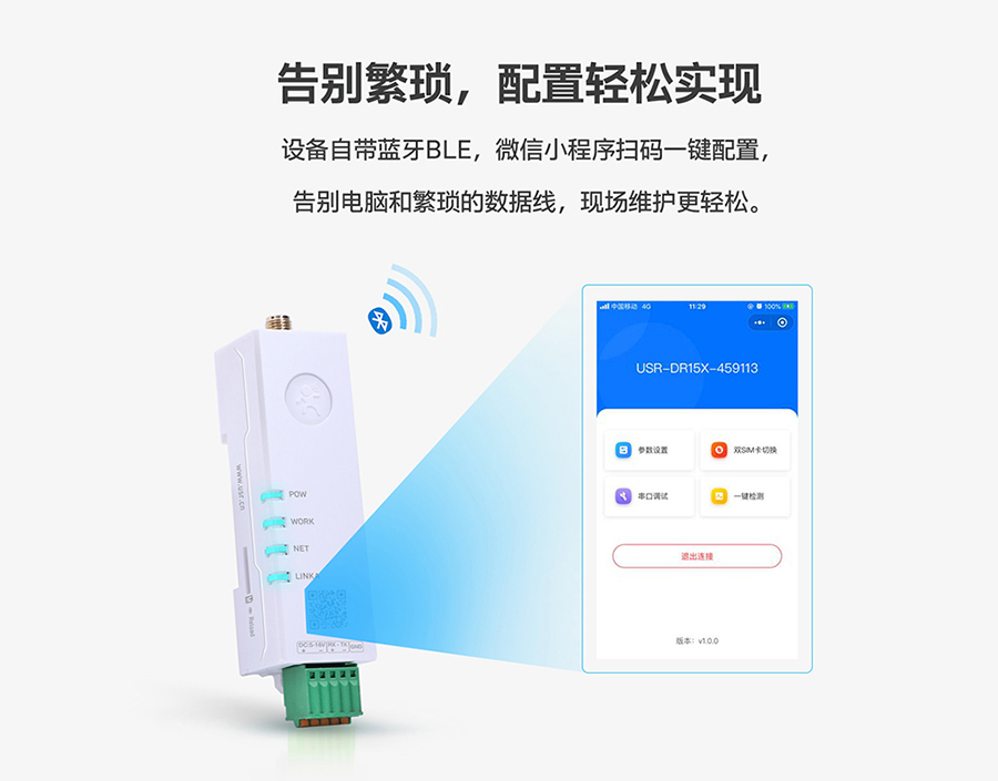首先,DR154采用人性化設(shè)計(jì),設(shè)備自帶藍(lán)牙BLE,用戶無(wú)需了解復(fù)雜的數(shù)據(jù)傳輸過(guò)程,也無(wú)需攜帶笨重的電腦,只需拿出手機(jī),掃描DR154外殼上的二維碼,自動(dòng)開啟藍(lán)牙建立連接,通過(guò)簡(jiǎn)單配置,即可進(jìn)行無(wú)線數(shù)據(jù)收發(fā),完美解決小數(shù)據(jù)量在復(fù)雜環(huán)境中的超遠(yuǎn)距通信問(wèn)題。