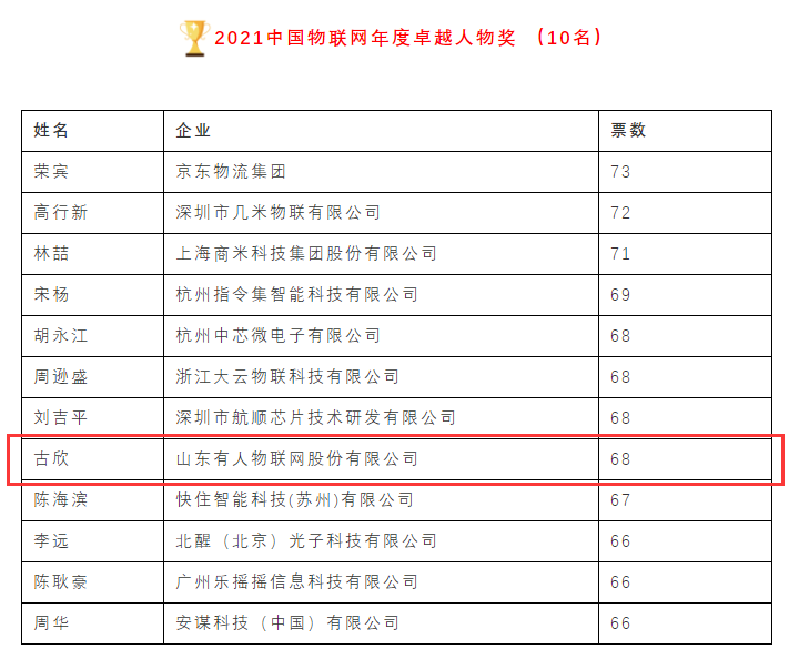 2022年3月16日,“2021年物聯(lián)之星”中國物聯(lián)網(wǎng)產(chǎn)業(yè)年度評選結(jié)果正式揭曉。本屆“物聯(lián)之星”評選自啟動以來吸引了超500家物聯(lián)網(wǎng)全產(chǎn)業(yè)鏈上的優(yōu)秀企業(yè)參與,共有800余名行業(yè)專家評委參與投票。最終,有人物聯(lián)網(wǎng)董事長古欣獲2021年度物聯(lián)網(wǎng)年度卓越人物獎,有人物聯(lián)網(wǎng)獲2021年度最具有投資價值企業(yè)獎、2021年度最有影響力物聯(lián)網(wǎng)通訊企業(yè)獎。