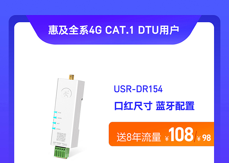 以DR154為例,產(chǎn)品+八年流量?jī)H售108元。108元,即可擁有:性能超強(qiáng)的DTU產(chǎn)品+八年流量+有人品質(zhì)服務(wù),這也太劃算了! 八年的流量基本能覆蓋電子產(chǎn)品的生命周期,意味著全程無需用戶再自購(gòu)流量,解決了充值續(xù)費(fèi)的煩惱。