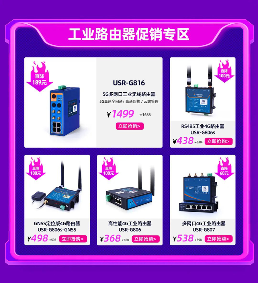 多款產(chǎn)品1元秒:四次秒殺環(huán)節(jié)(3點(diǎn)、3點(diǎn)半、4點(diǎn)半、5點(diǎn)),5G工業(yè)路由器、Cat.1DTU 、串口服務(wù)器、4G 工業(yè)路由器,價(jià)值千元產(chǎn)品一元到手!