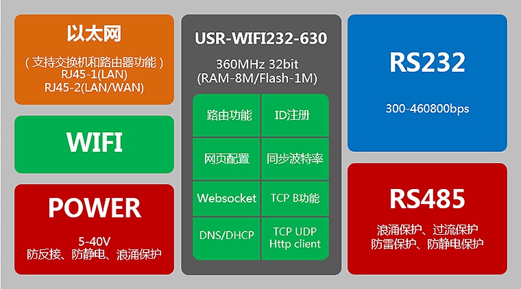 630網(wǎng)絡(luò)功能接口支持“WIFI”和“雙以太網(wǎng)口”,雙網(wǎng)口支持路由功能,串口功能接口支持“RS232”和“RS485”任意選擇一種(但不支持同時(shí)使用)。630不僅可以實(shí)現(xiàn)232/485轉(zhuǎn)WIFI、232/485轉(zhuǎn)以太網(wǎng),甚至可以實(shí)現(xiàn)以太網(wǎng)與WIFI的雙向數(shù)據(jù)透?jìng)鳌?/p>