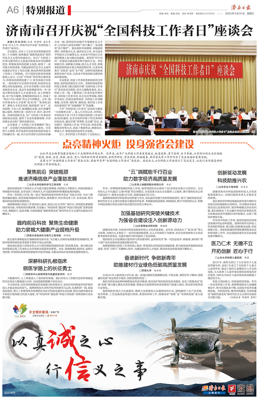 5月30日上午,濟(jì)南市慶?!叭珖?guó)科技工作者日”座談會(huì)在龍奧大廈舉行。市委常委、副市長(zhǎng)孫斌,市政府副秘書長(zhǎng)吳劍,市科協(xié)黨組書記、副主席賈文濤,市科技局黨組成員、副局長(zhǎng)王芳,市科協(xié)黨組成員、副主席李武、潘玉斌等領(lǐng)導(dǎo)出席會(huì)議。作為2023年度濟(jì)南市優(yōu)秀科技工作者,有人物聯(lián)網(wǎng)董事長(zhǎng)參加會(huì)議。