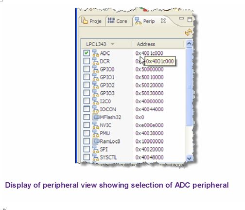 4.1.2.1 外設(shè)觀察窗口 LPCXpresso IDE有一個(gè)包含所有外設(shè)的注釋、交互式調(diào)試觀察窗口??梢酝ㄟ^標(biāo)簽項(xiàng)選擇寄存器觀察窗口或者外設(shè)觀察窗口。外設(shè)被選中后,會(huì)在控制臺(tái)觀察窗口顯示“memory”觀察窗口。分別如下圖所示。
