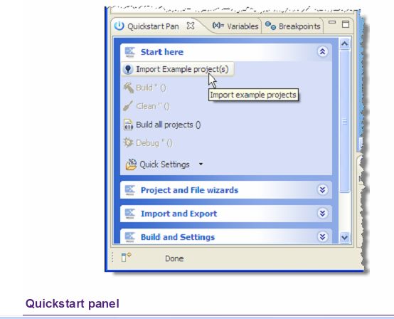 l 在快速啟動(dòng)面板中,單擊“Start Here”,然后選擇”Import Example project(s)“。如下圖所示。l 在彈出的頁面中,從“Browse”中選擇例程所在的目錄。根據(jù)提示打開例程即可。如下圖。