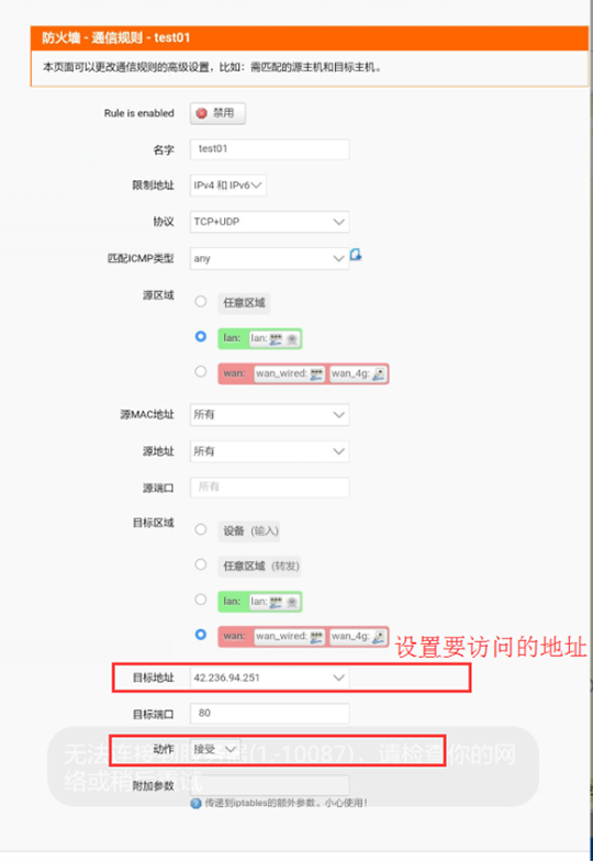 第三步,為新建的規(guī)則進(jìn)行命名,然后在“目標(biāo)地址”中選擇需要限制上網(wǎng)的IP地址,“動(dòng)作”命令中選擇“接受”,最后點(diǎn)擊“保存”。
