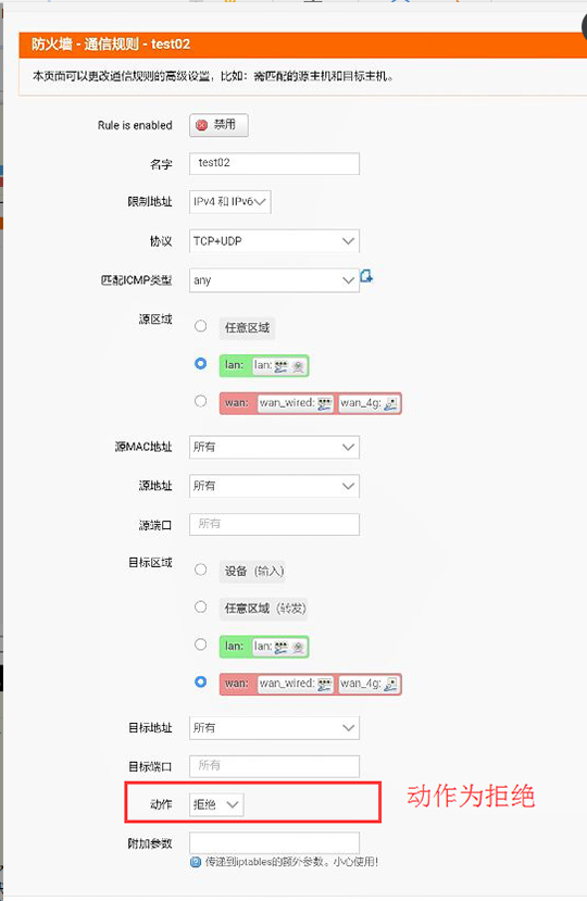 第四步,再次新建一個(gè)規(guī)則,用于屏蔽互聯(lián)網(wǎng)網(wǎng)站,“動(dòng)作”命令中選擇“拒絕”,目標(biāo)地址和MAC地址選擇“所有”,然后進(jìn)行保存,并重啟生效。