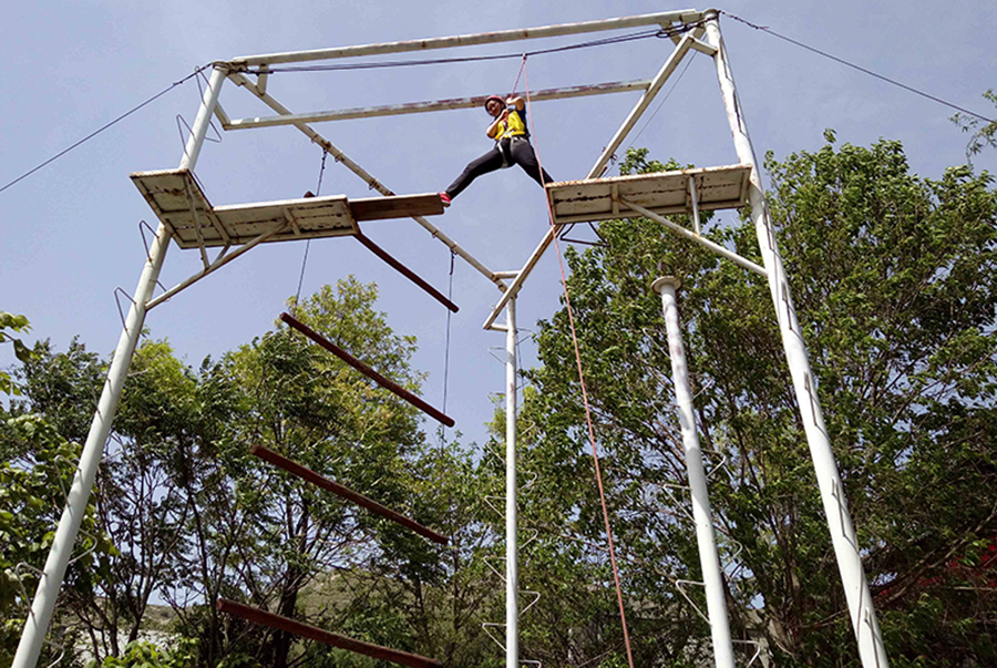 在距離地面8米的高空搭起了一座獨木橋,橋的中間斷開1.2米-1.4米。要求隊員爬上8米的高空后,從一側邁到另一側,再從另一側邁回來,隊員要完成兩次跨越...