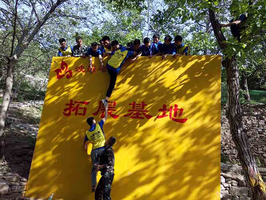 要求全隊所有成員在規(guī)定的時間內(nèi)翻越一面高4.26米的光滑墻面,在此過程中,大家不能借助任何外界的工具,所能用的資源只有每個人的身體。