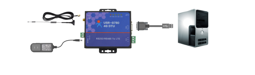 準(zhǔn)備將4G DTU進(jìn)行數(shù)據(jù)透?jìng)髦?,先將電腦串口連接到4G DTU串口上。如果是沒(méi)有硬件串口的電腦,可以通過(guò)USB轉(zhuǎn)RS232串口轉(zhuǎn)換線進(jìn)行連接,如下圖的連接方式: