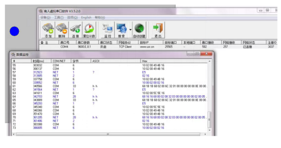 第四,數據監(jiān)控。虛擬串口軟件點擊監(jiān)控。COM為組態(tài)軟件發(fā)送的數據,NET為PLC通過GPRS網絡發(fā)給電腦端口的數據。能發(fā)送能接收,說明數據傳輸正常。