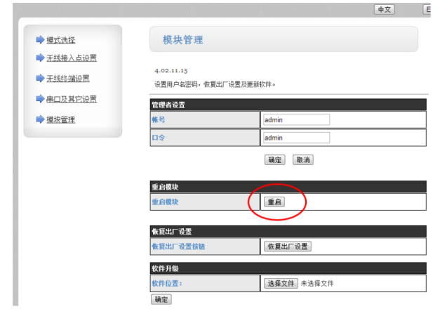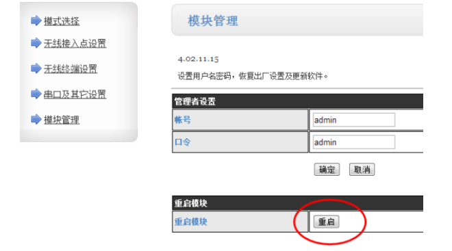3.在“模塊管理”界面點擊“重啟”,模塊設(shè)置生效。對AP模塊的設(shè)置完成,將AP模塊斷電。
