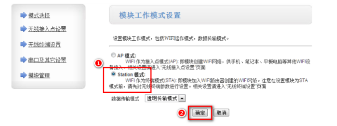 1..電腦與模塊的無線信號連接后,打開瀏覽器輸入10.10.100.254,賬戶密碼均為admin,進(jìn)入內(nèi)置網(wǎng)頁設(shè)置界面。設(shè)置模塊為STA模式,點擊“確定”按鈕。