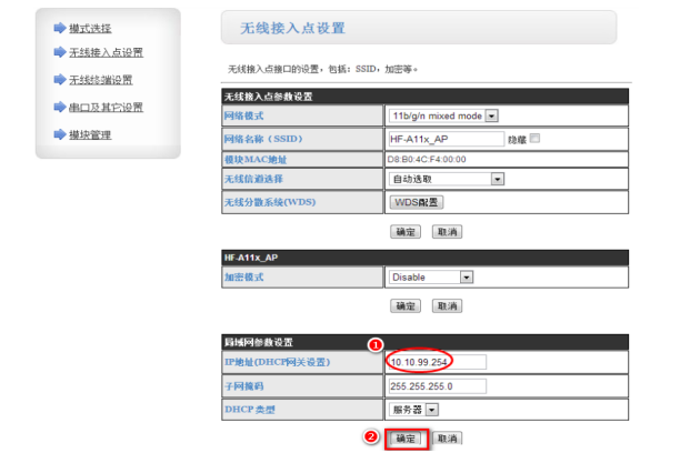 2.進(jìn)入“無線接入點設(shè)置”界面后,將“局域網(wǎng)參數(shù)設(shè)置”中的IP地址即LAN IP改為10.10.99.254。點擊“確定”保存。