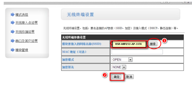 3.進(jìn)入無線終端設(shè)置界面,點擊搜索,選擇搜索到的AP模塊的SSID,選擇完成后,點擊“確定”保存。