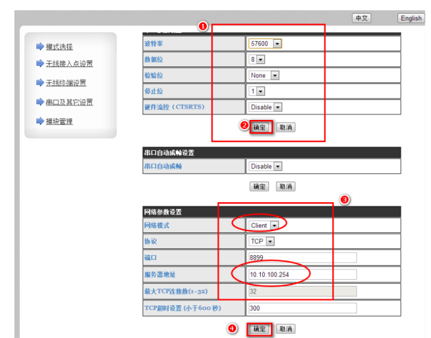4.進(jìn)入“串口及其它設(shè)置”頁面后,修改波特率數(shù)據(jù)位檢驗為停止位和設(shè)備、AP模塊一致,修改完后點擊”確定“保存,然后將網(wǎng)絡(luò)參數(shù)設(shè)置中的網(wǎng)絡(luò)模式改為Client,服務(wù)器地址改為10.10.100.254,點擊”確定“保存。