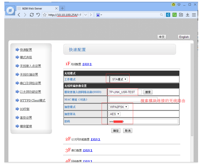 第二,快捷設(shè)置。輸入USR-WIFI232模塊默認(rèn)的IP地址10.10.100.254進(jìn)入配置界面。工作模式設(shè)置為STA模式,然后搜索WiFi模塊要連接的路由器ssid,設(shè)置成功后在模塊管理內(nèi)重啟模塊。