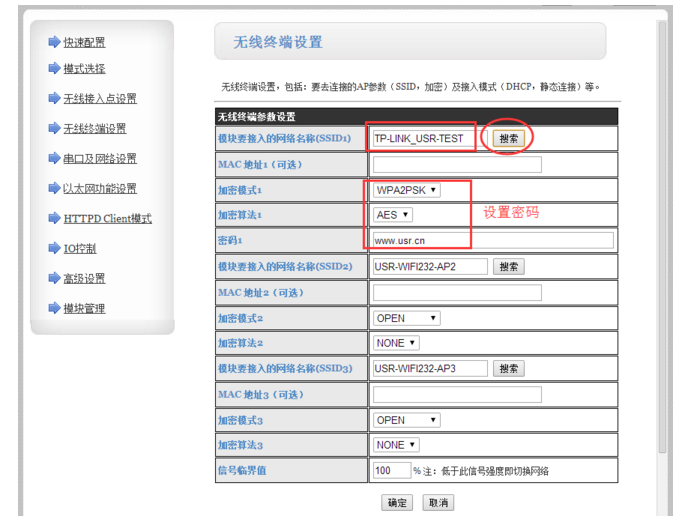 第四,設(shè)置SSID和加密方式。在無線終端的設(shè)置包括去連接的AP參數(shù),及接入模式等。