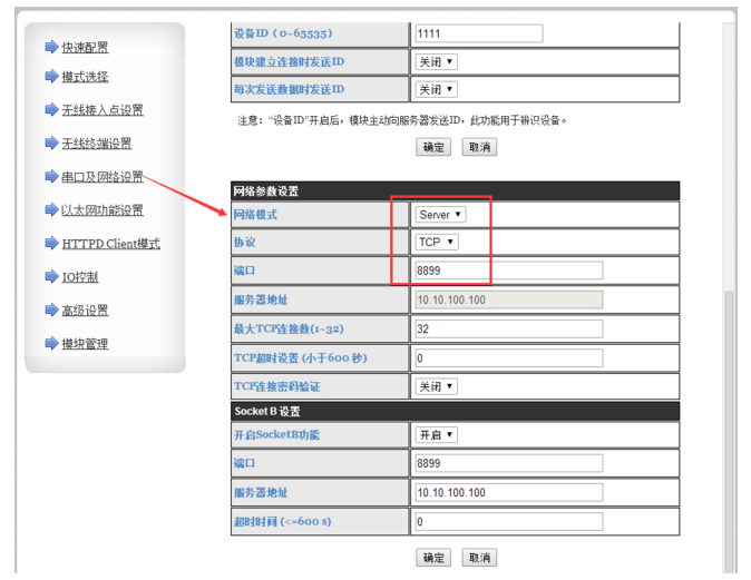 第六,對模塊的網(wǎng)絡(luò)參數(shù)進(jìn)行設(shè)置。主要設(shè)置網(wǎng)絡(luò)模式,協(xié)議及端口,網(wǎng)絡(luò)模式設(shè)置為Server,協(xié)議設(shè)置成TCP,端口為8898