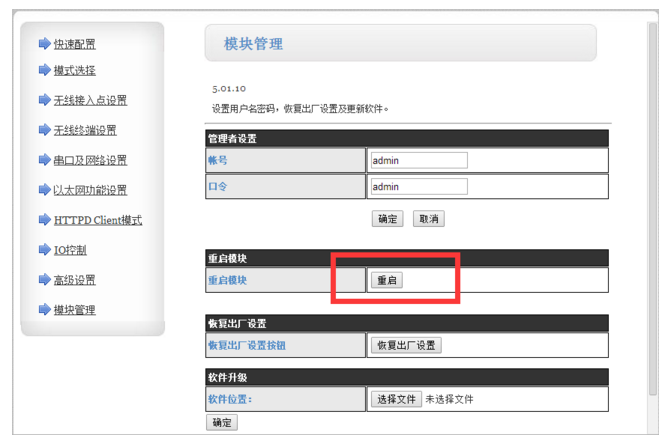 第七,重啟模塊??梢酝ㄟ^斷電重啟,也可以在模塊管理子頁面進(jìn)行重啟