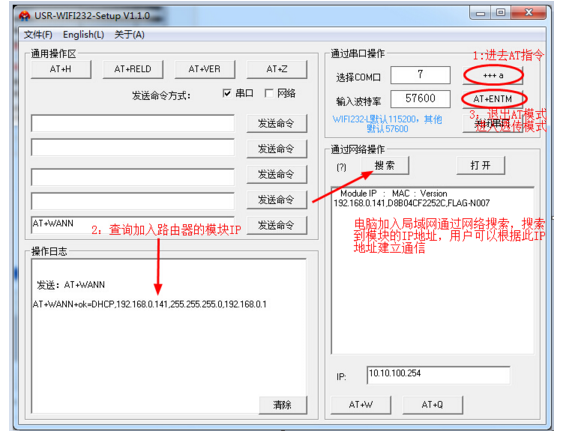 串口AT指令模式查詢模塊加入路由器之后自動獲取的IP地址:查詢到模塊加入路由器的IP地址為192.168.0.141。網(wǎng)絡(luò)搜索查詢模塊加入路由器的IP地址。