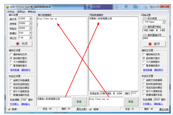 第九,進(jìn)行通信測試。串口與電腦相連,電腦連接局域網(wǎng),模塊加入局域網(wǎng)。模塊串口數(shù)據(jù)發(fā)送到網(wǎng)絡(luò)端,網(wǎng)絡(luò)端發(fā)送數(shù)據(jù)到模塊串口端。