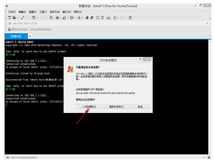 步驟五,在SSH安全警告頁面選擇一次性接受