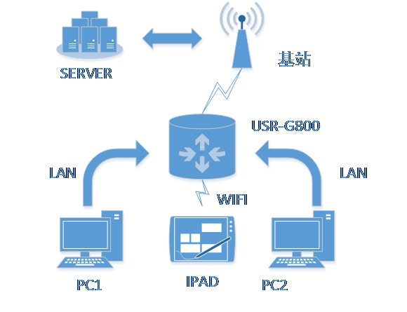 這樣的組網(wǎng)方式下,路由器不需要進行任何設置,接上網(wǎng)線,插上擁有4G流量的SIM卡,給路由器供電即可。最大程度的減少了客戶的設置過程,方便快捷。在這種組網(wǎng)方式下,路由器自帶的WIFI的功能也可以同時工作,最大程度的增加用戶的局域網(wǎng)的接入數(shù)量。