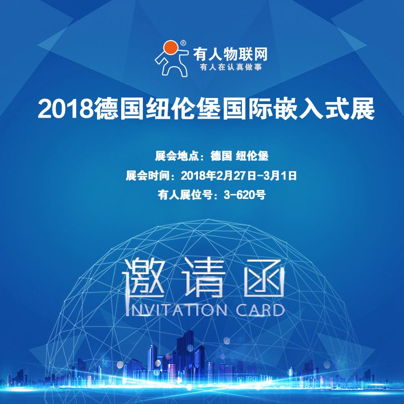 2018年2月27日,德國紐倫堡嵌入式自動化展將盛大開幕。本屆展會是嵌入式體系業(yè)界重要的年度盛會之一,也是全球規(guī)劃最大的嵌入式展會,是嵌入式職業(yè)經(jīng)濟發(fā)展和歐盟工業(yè)發(fā)展趨勢的晴雨表。有人科技作為嵌入式通訊領(lǐng)域?qū)<?,必將前往國際性嵌入展覽會,展示嵌入式設(shè)備和體系領(lǐng)域的最新成功研制結(jié)果。
