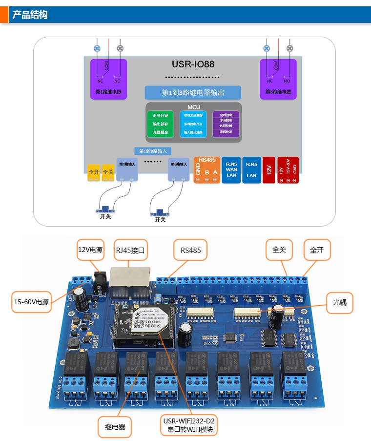 - 8路可配置輸入,既可以上報輸入狀態(tài)也可以控制繼電器