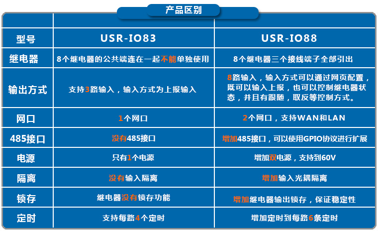 USR-IO88是本公司新推出的8入8出控制設(shè)備,用戶可以在直連,局域,遠程三種方式下實時,定時控制設(shè)備。輸出部分我們將繼電器三個端子全部引出供用戶使用,輸入部分我們提供網(wǎng)頁配置輸入模式,可在純輸入方式,控制繼電器方式之間任意切換。