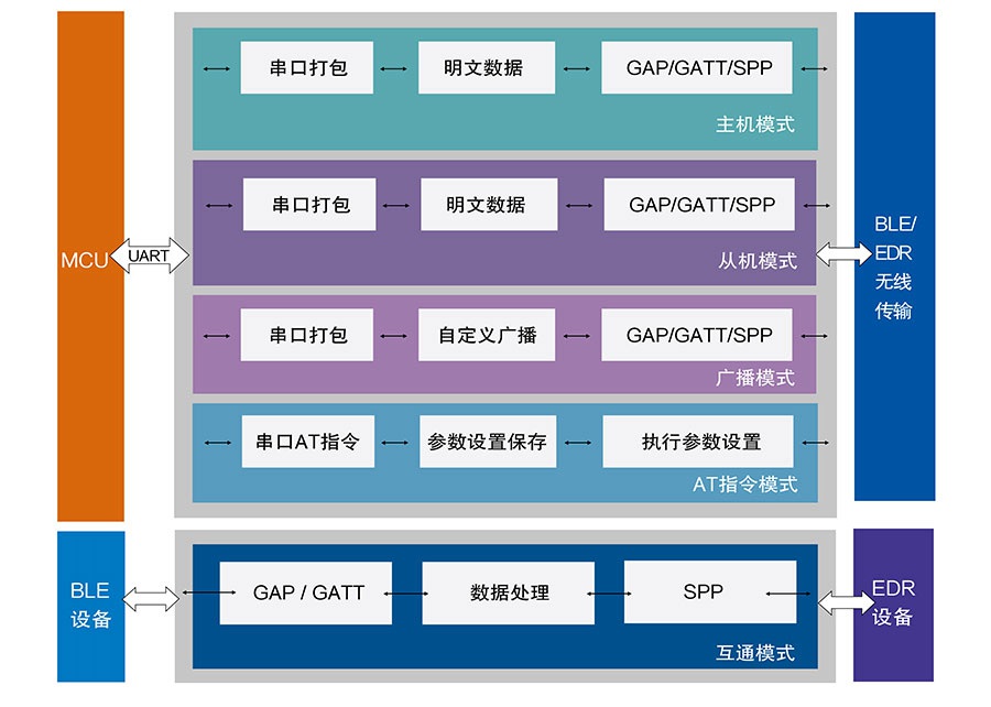 如果有些特殊項(xiàng)目必須在EDR與BLE兩個(gè)不同模式下建立數(shù)據(jù)傳輸方式,可采用互通模式;
